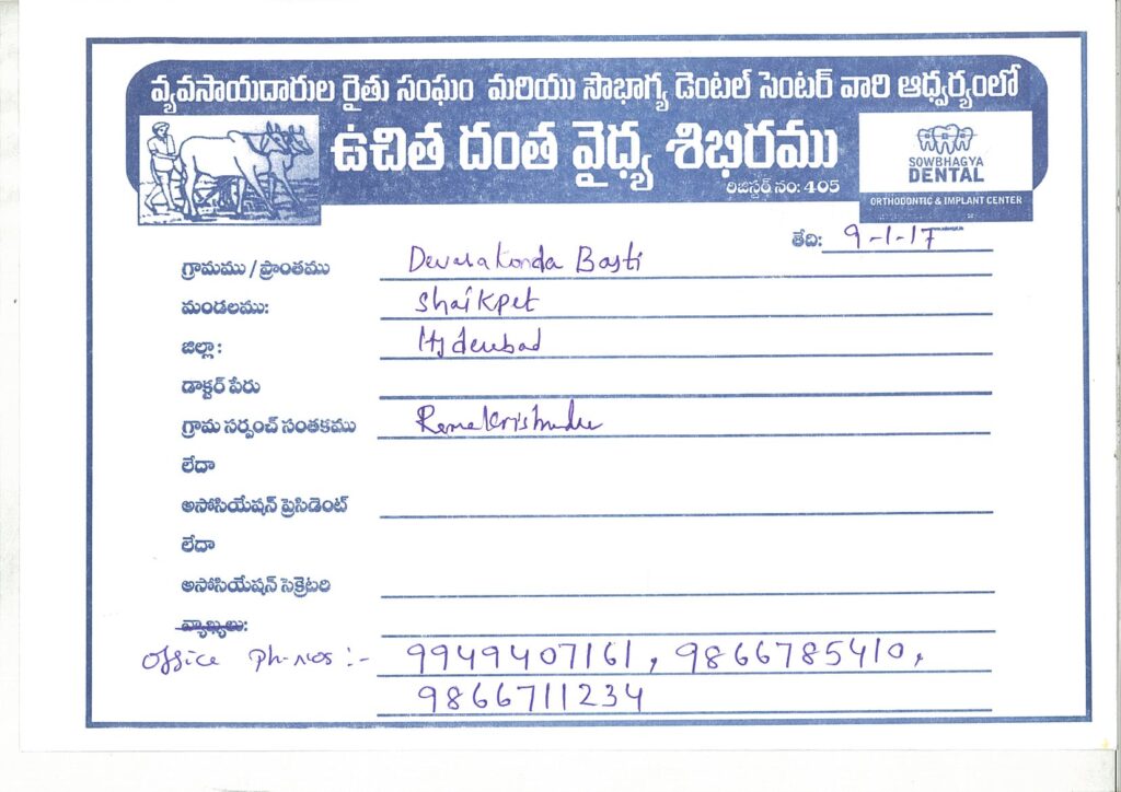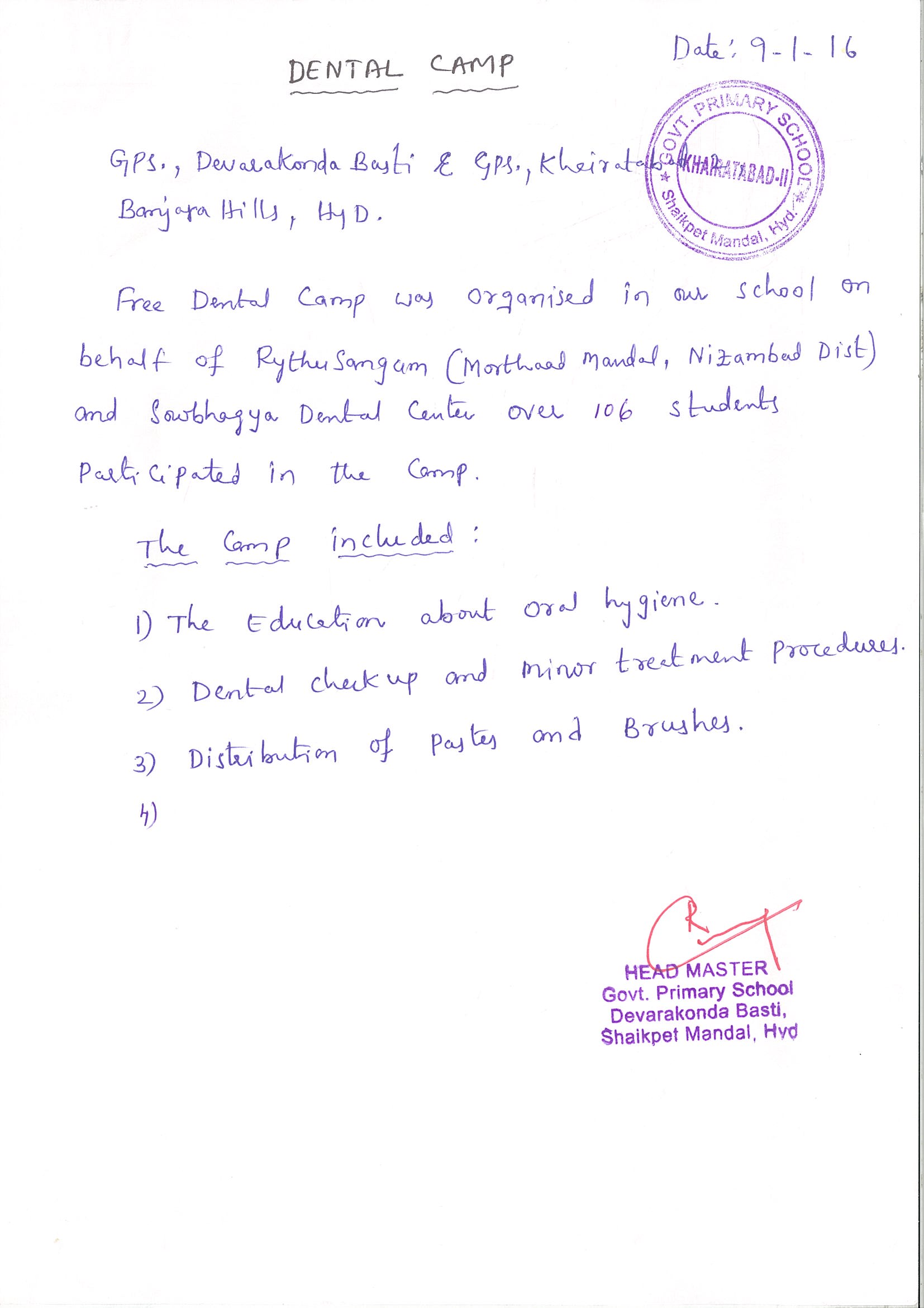 Dental camp was organized in GPS, DEVARKONDA BASTI KHAIRATABAD, BANJARA HILLS, HYDERABAD by Sowbhagya Dental Center on behalf of Farmers Association on09-01-2016.