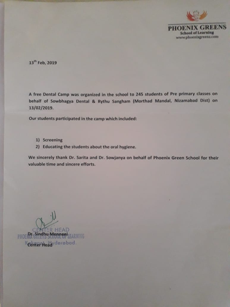 A Dental Camp was organized by Dr. Saritha Reddy on behalf of Rythu Sangam and Sowbhagya Dental Center at Phoenix Green School, Kokapet HYDERABAD.