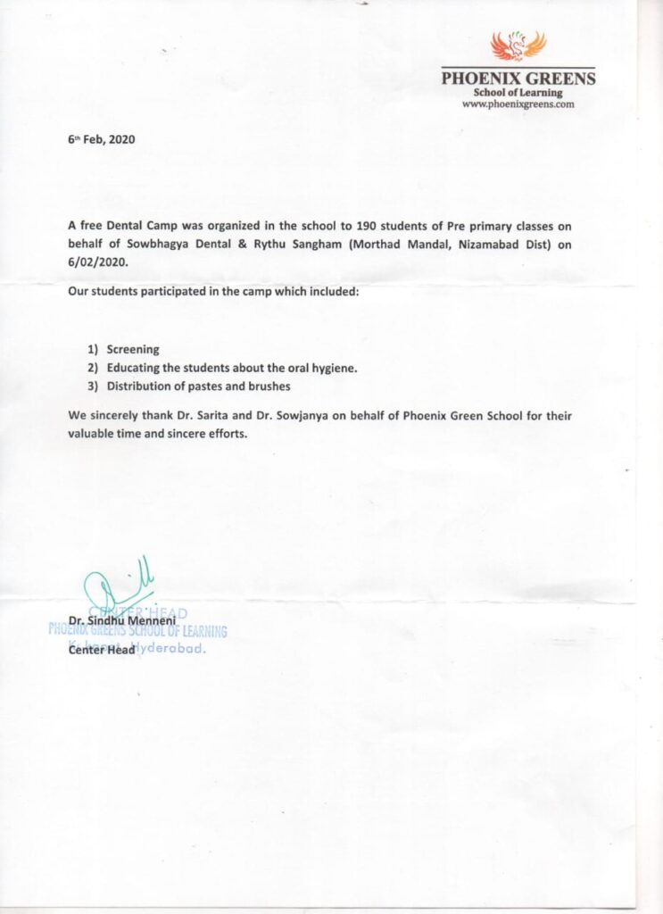 A free Dental camp was organized in Phoenix Green School, Kokapet, Rangareddy District, Telangana by Dr. Saritha Reddy (Sowbhagya Dental Center) on behalf of Rythysangam, Morthad Mandal, Nizamabad District on 06-02-2020
