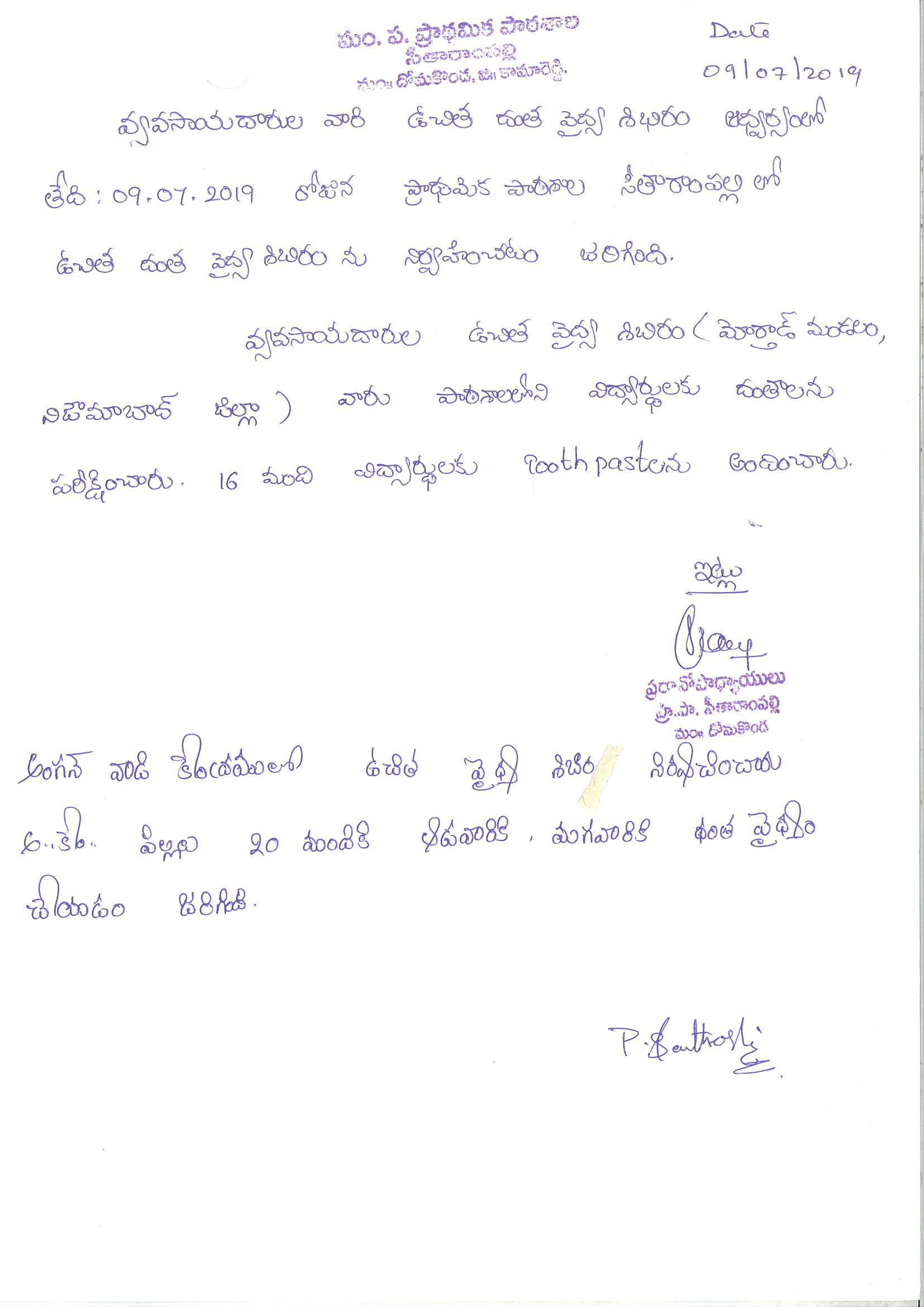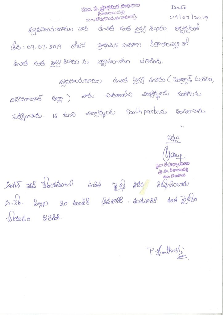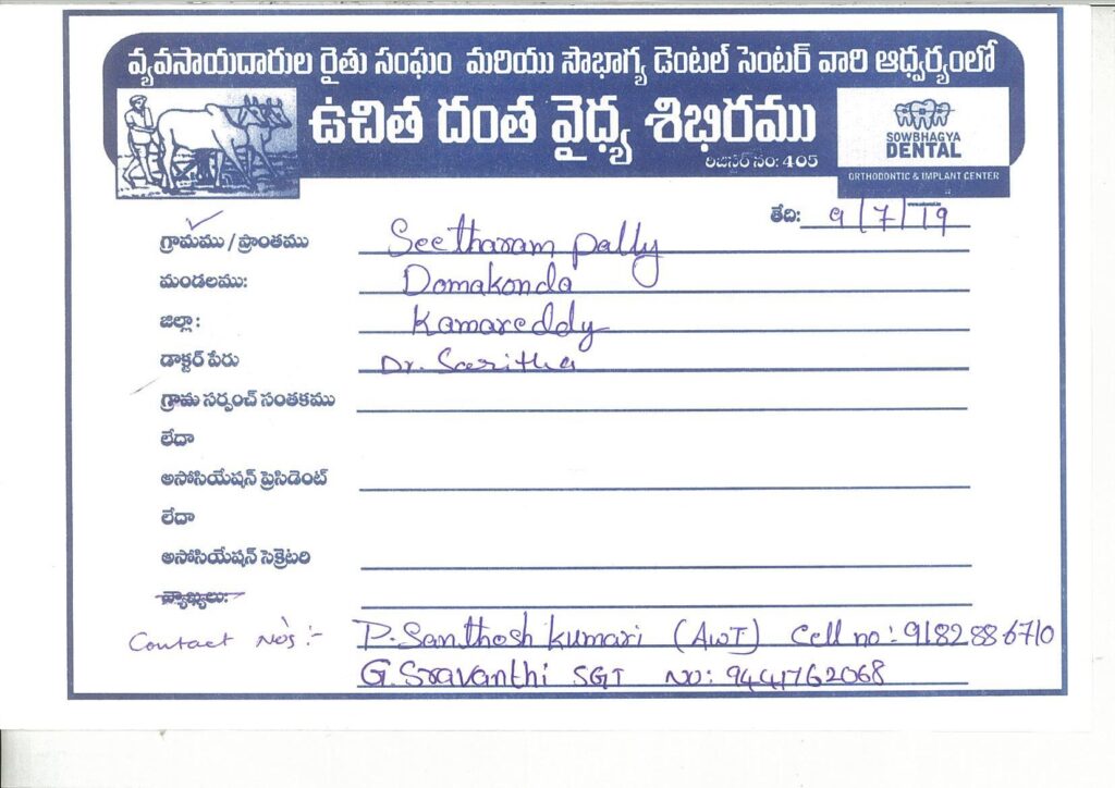 A free Dental camp was organized in Anganwadi and Primary School, Sitarampally, Kamareddy by Dr. Saritha Reddy (Sowbhagya Dental Center) on behalf of Rythysangam, Morthad Mandal, Nizamabad District on 09-07-2019